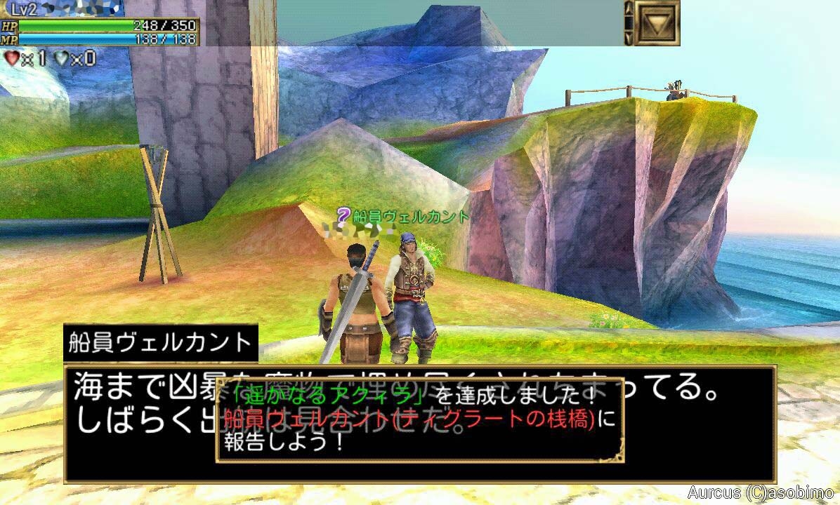 クエスト条件を達成した時点で、達成ウインドウが最前に表示されます。受注時に指示のあった報告先へ行き、クエストを進めていきます。
