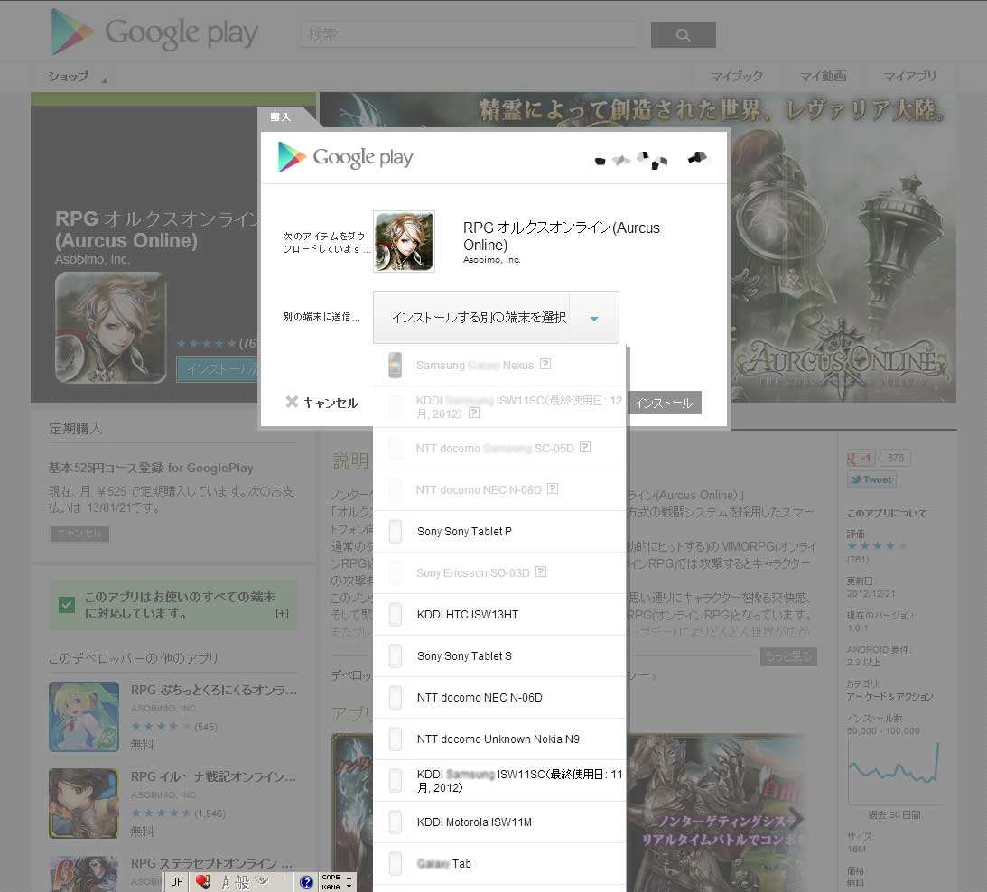 PCブラウザ上から、Google Play←こちらをクリックして、Googleアカウントでログインします。 『インストール』ボタンをクリックすると、インストール先の端末を選択する画面が表示されますので、端末名をクリックすると自動遠隔インストールが始まります。